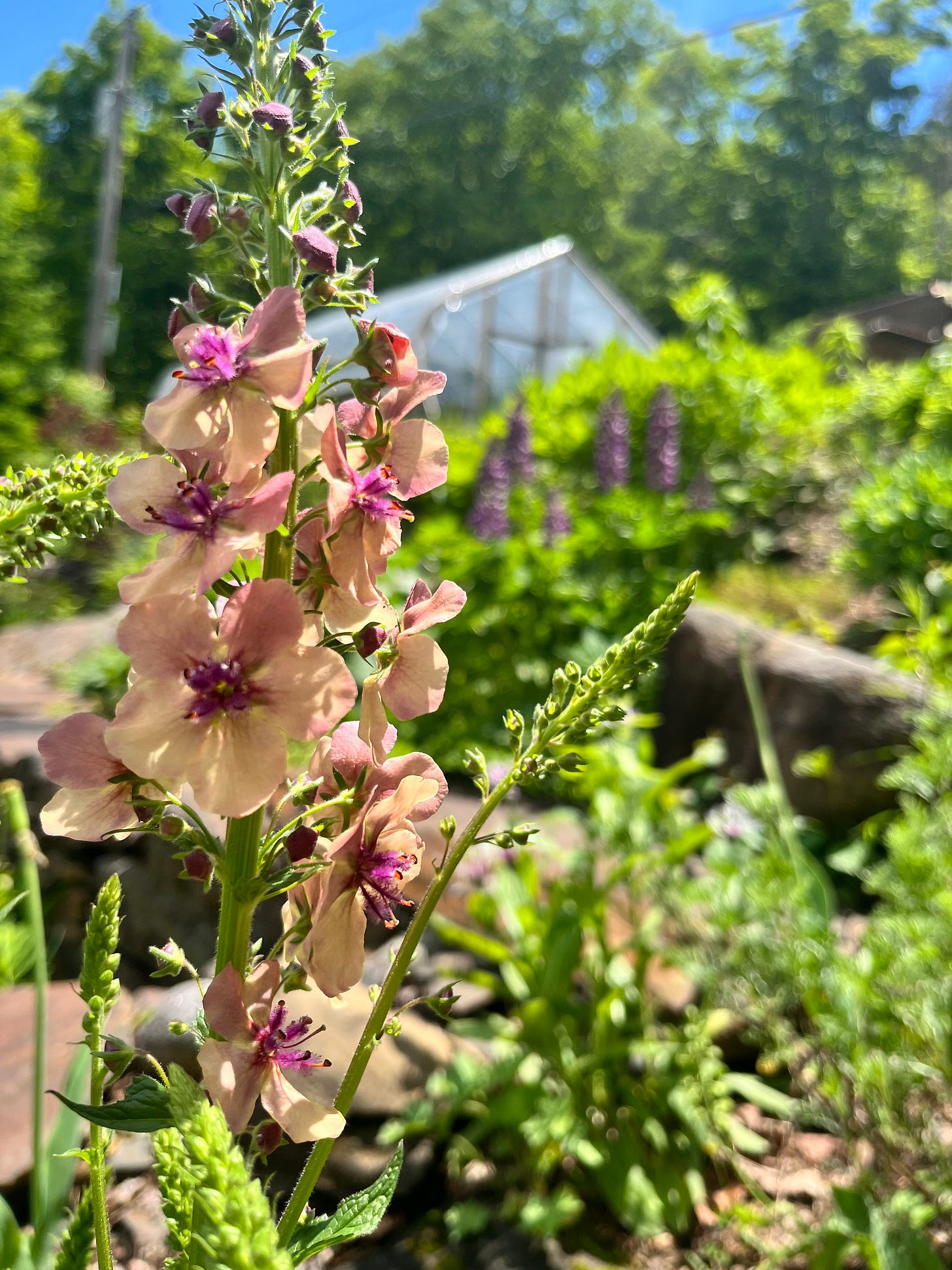Drinking in the magnificent peach and purple of the Verbascum is a yearly ritual around now. I welcome her with excitement and joy and she spires up and waves back with the kiss of a soft breeze. I think she looks forward to seeing me too.