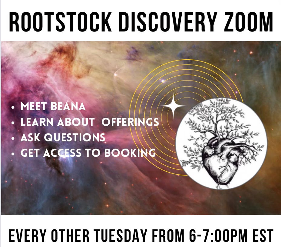 Tuesday, June 18th - Rootstock Discovery Zoom - 6pm Come learn all about my healing practice, seasonal immersions, get your questions answered, and learn how to book!